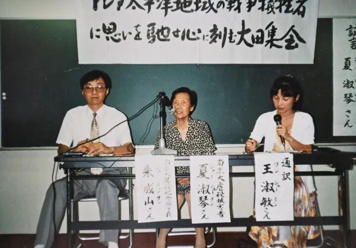 1994年8月6日,夏淑琴(中)在日本举行的集会上提供证言(翻拍照片)。新华社发