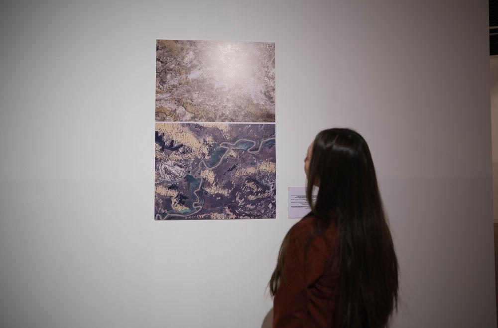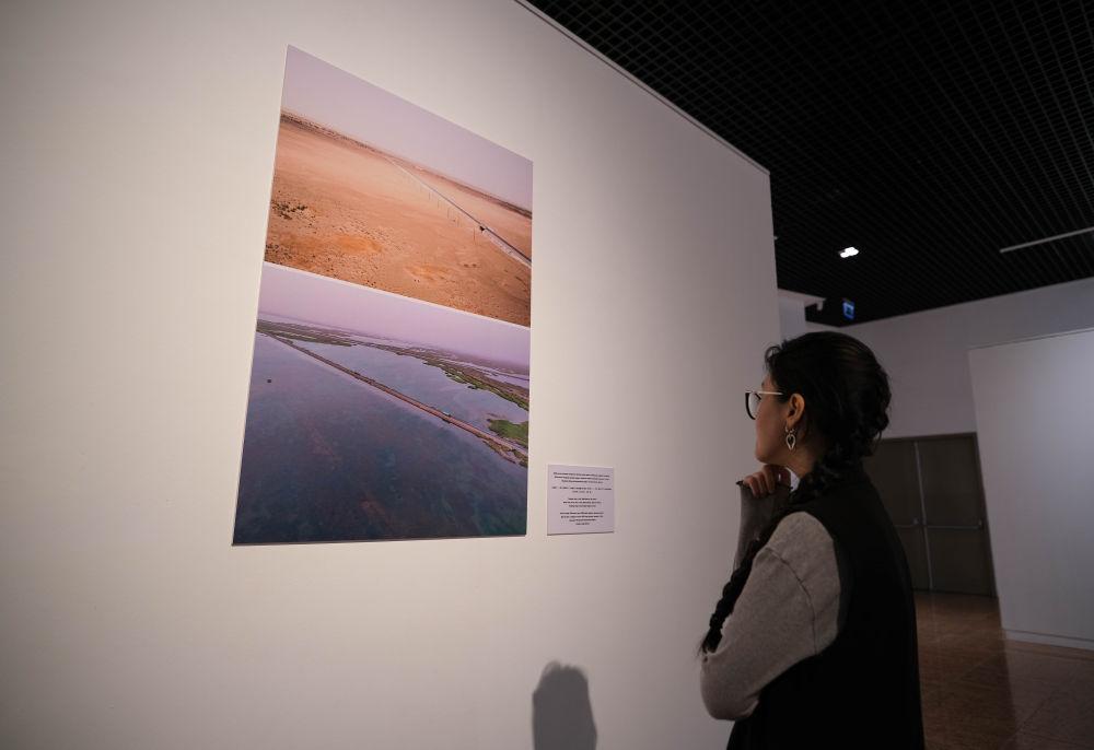 12月10日,在哈萨克斯坦阿斯塔纳的国家博物馆,参观者在图片展上观赏新疆塔里木河畔治沙工程的拼版对比照片。