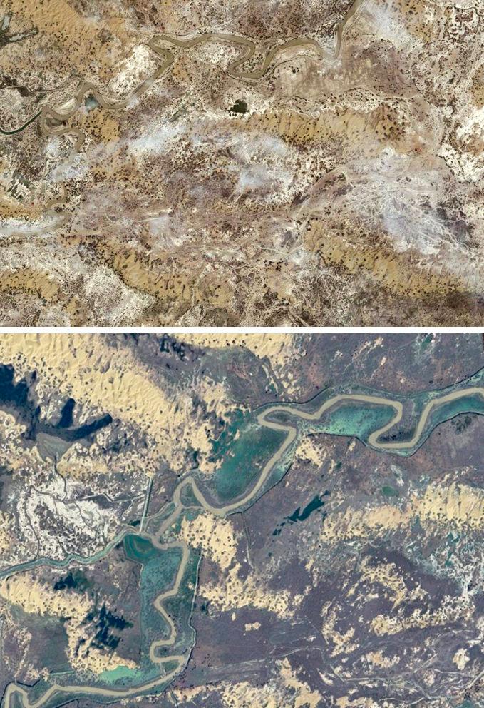 拼版卫星照片:上图为2010年8月14日拍摄的新疆巴音郭楞蒙古自治州尉犁县境内的塔里木河支流乌斯满河和周边地区;下图为2024年8月8日拍摄的新疆巴音郭楞蒙古自治州尉犁县境内的塔里木河支流乌斯满河和周边地区。该地区植被覆盖度和胡杨林地面积显著提升。新华社发