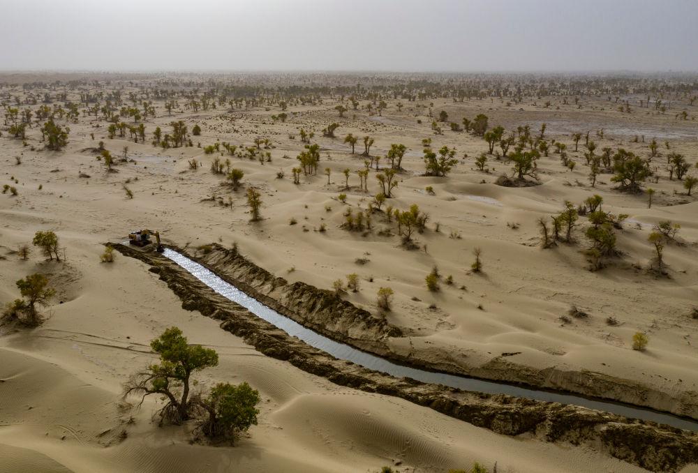 这是2025年9月19日在新疆巴音郭楞蒙古自治州尉犁县境内的塔克拉玛干沙漠拍摄的人工挖掘的引洪补水生态渠(无人机照片)。