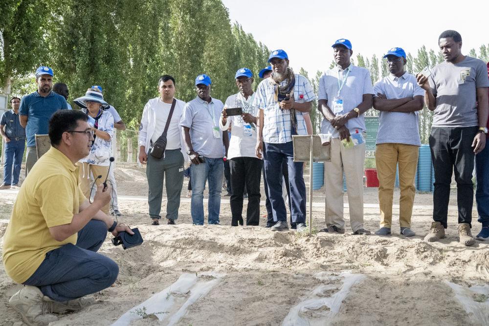 2023年6月13日,在中国科学院新疆生态与地理研究所策勒沙漠研究站,中方专家向非洲和中亚学员介绍荒漠植物。