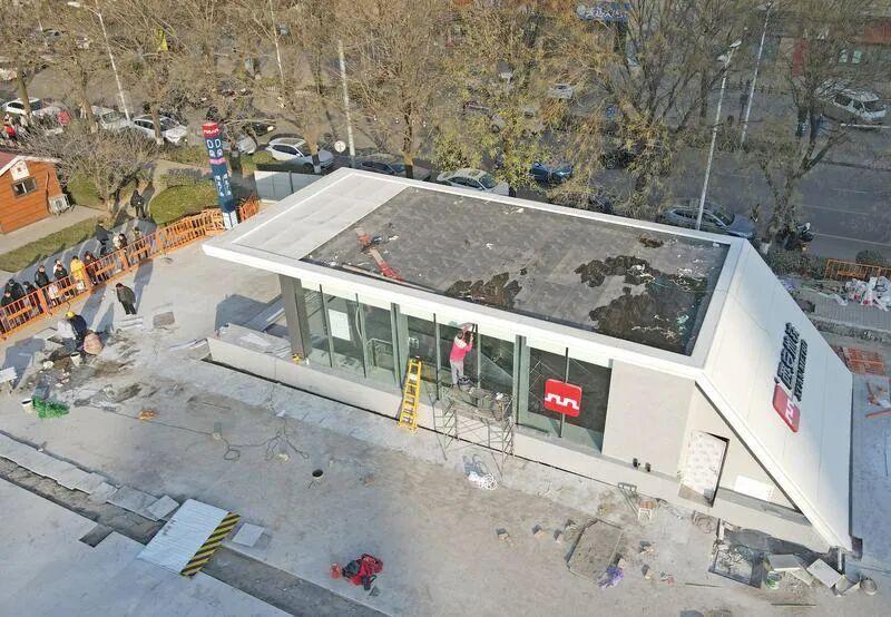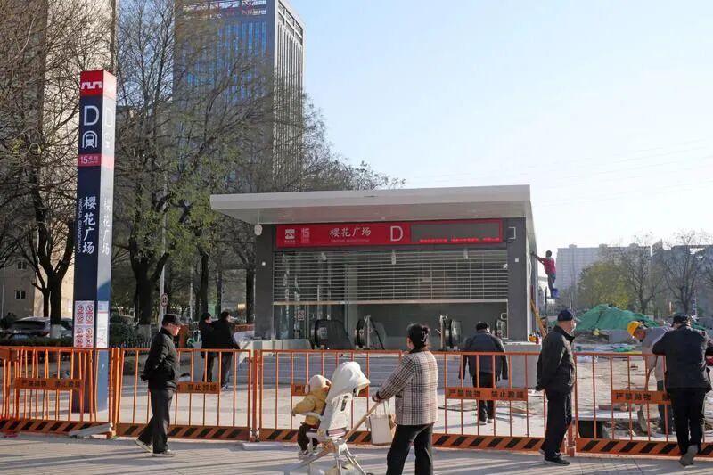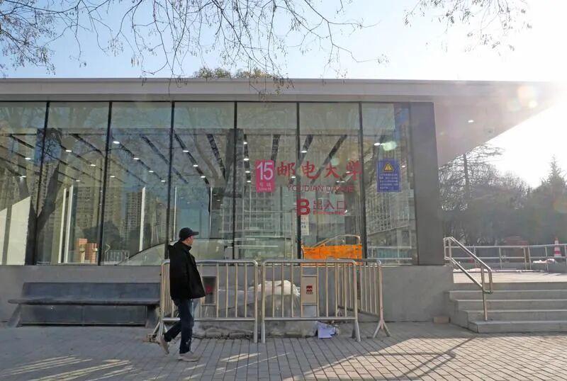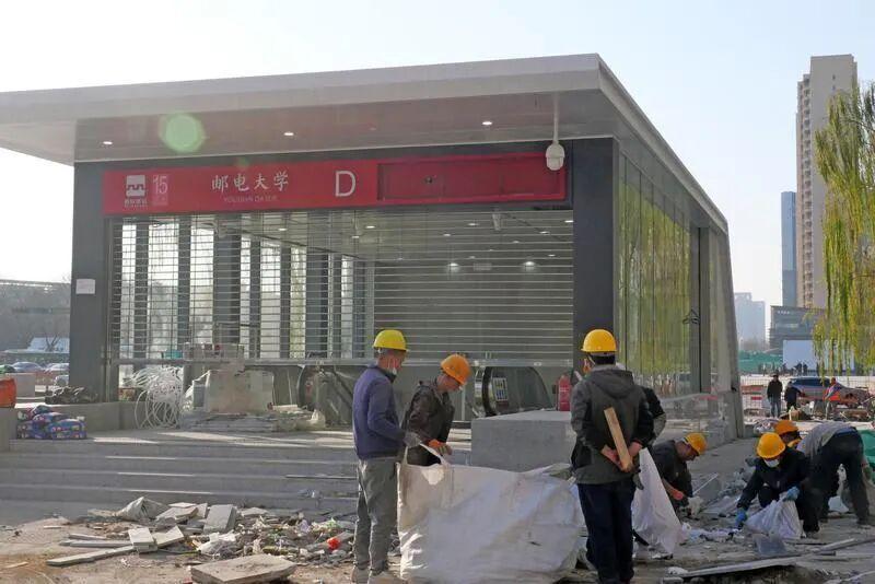 12月16日,西安地铁15号线的建设现场正进行收尾作业。邮电大学站、樱花广场站的出入口外立面基本完工,红色的线路标识与站点名称醒目清晰。