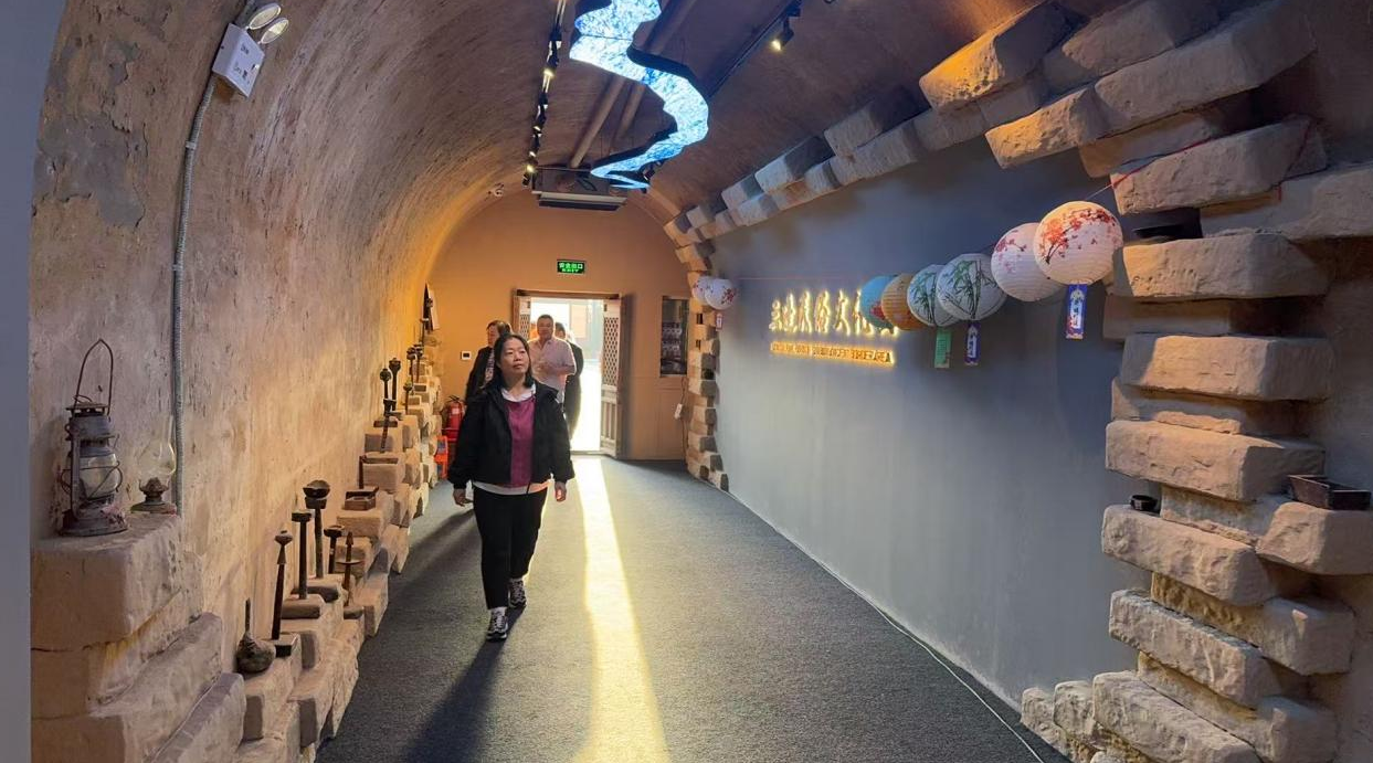 园区内的隧道式民俗展陈空间更是亮点十足,斑驳的土墙两侧陈列着老油灯、旧农具等老物件,搭配灯笼、彩绘等装饰,光影交错间勾勒出三边地区的生活变迁脉络。游客们漫步其间,触摸老物件、聆听民俗故事,沉浸式感受塞上民俗的独特魅力。“这些老物件太有年代感了,能直观感受到三边的历史和生活,带孩子来特别有教育意义。”来自延安的游客李女士感慨道。
