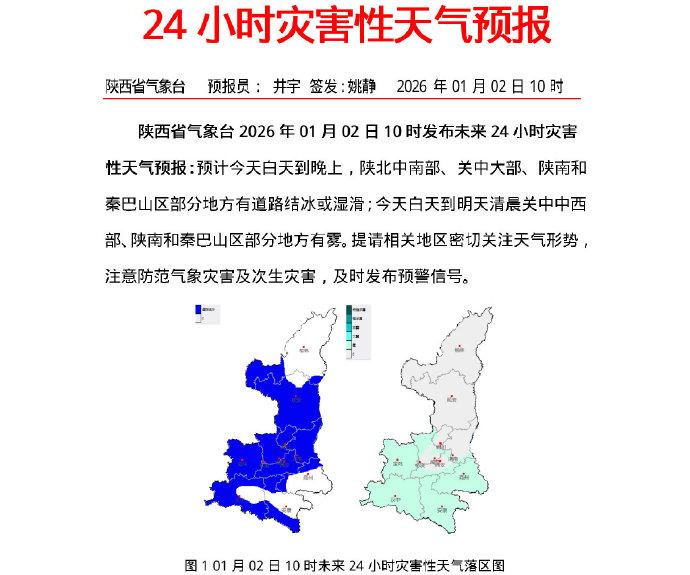 预计今天白天到晚上,陕北中南部、关中大部、陕南和秦巴山区部分地方有道路结冰或湿滑;今天白天到明天清晨关中中西部、陕南和秦巴山区部分地方有雾。提请相关地区密切关注天气形势,注意防范气象灾害及次生灾害,及时发布预警信号。