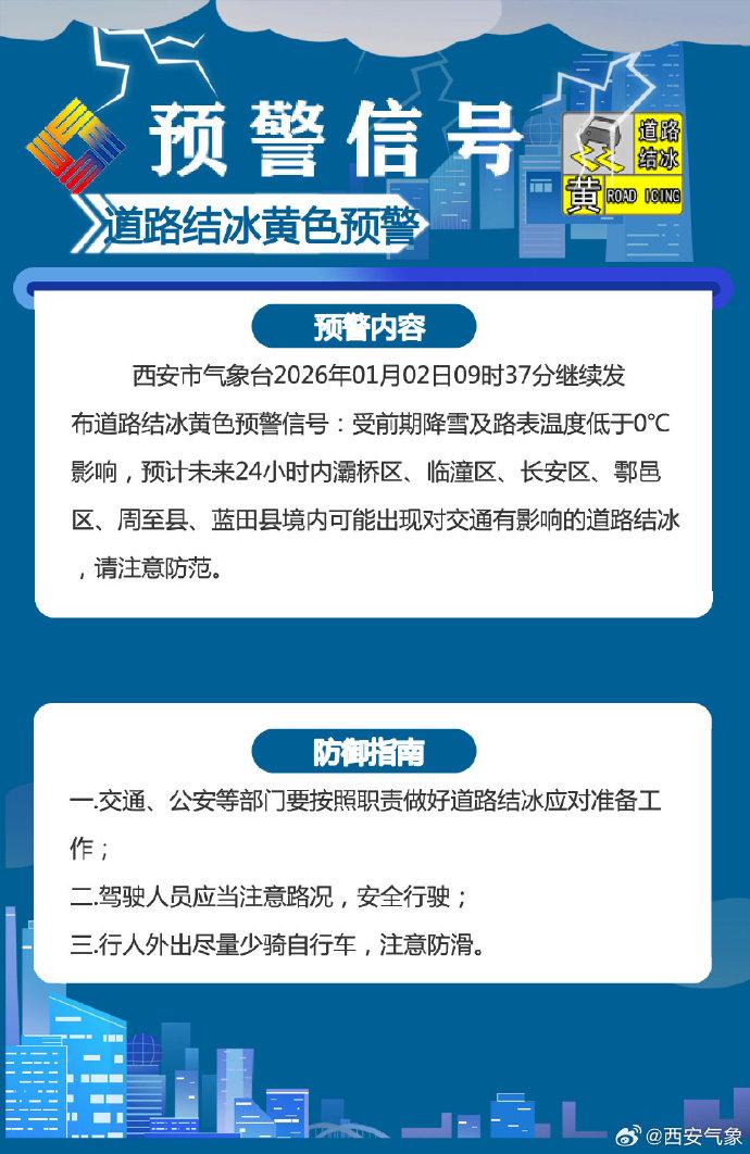受前期降雪及路表温度低于0℃影响,预计未来24小时内灞桥区、临潼区、长安区、鄠邑区、周至县、蓝田县境内可能出现对交通有影响的道路结冰,请注意防范。