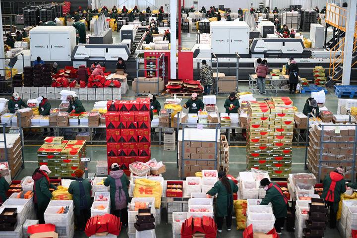 2025年1月6日,在延安市洛川县一家果业企业,工作人员在生产线工作。新华社记者 张博文 摄