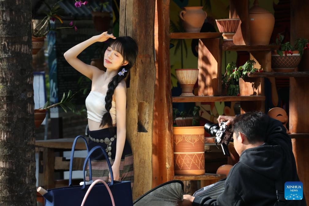 Tourists take photos at an ancient hamlet in Jinghong, southwest China's Yunnan Province on Jan. 2, 2026. China's economy kicked off 2026 with robust momentum, as evidenced by bustling economic activity in the year's first days. (Photo by Li Yunsheng/Xinhua)