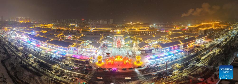A panoramic drone photo taken on Jan. 1, 2026 shows a light festival in Wuwei, northwest China's Gansu Province. China's economy kicked off 2026 with robust momentum, as evidenced by bustling economic activity in the year's first days. (Photo by Jiang Aiping/Xinhua)