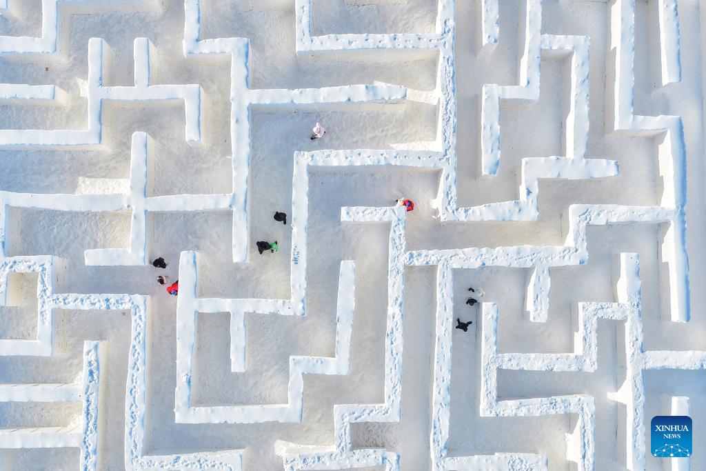 An aerial drone photo taken on Jan. 2, 2026 shows visitors exploring a giant maze made of ice and snow in Tongjiang, northeast China's Heilongjiang Province. China's economy kicked off 2026 with robust momentum, as evidenced by bustling economic activity in the year's first days. (Photo by Liu Wanping/Xinhua)