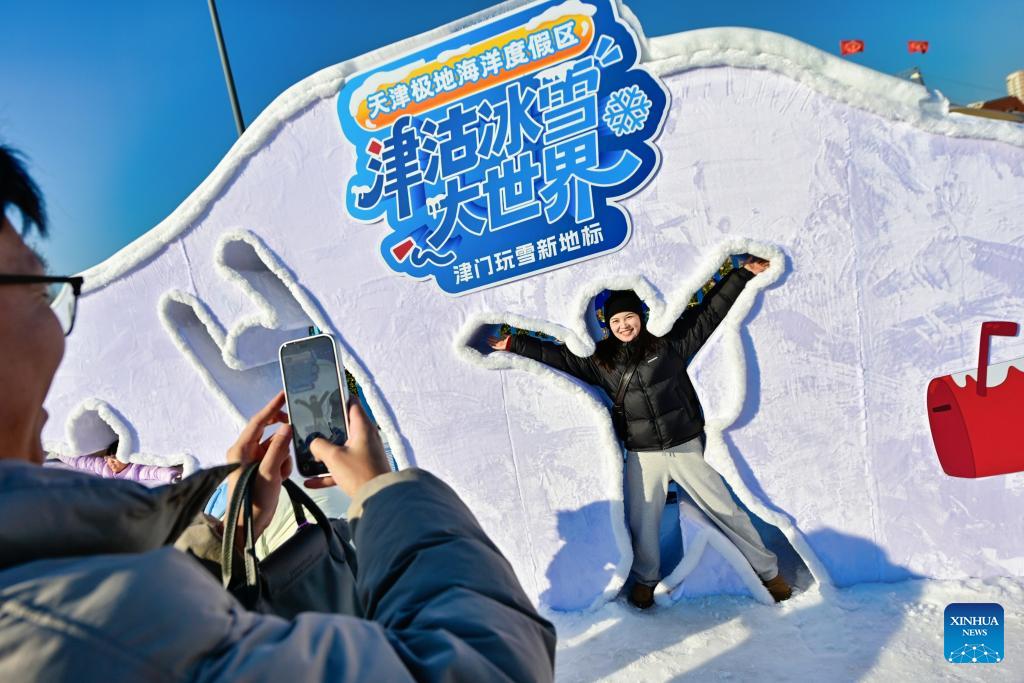 Tourists take photos at an ocean resort in Binhai New Area, north China's Tianjin on Jan. 2, 2026. China's economy kicked off 2026 with robust momentum, as evidenced by bustling economic activity in the year's first days. (Photo by Du Penghui/Xinhua)