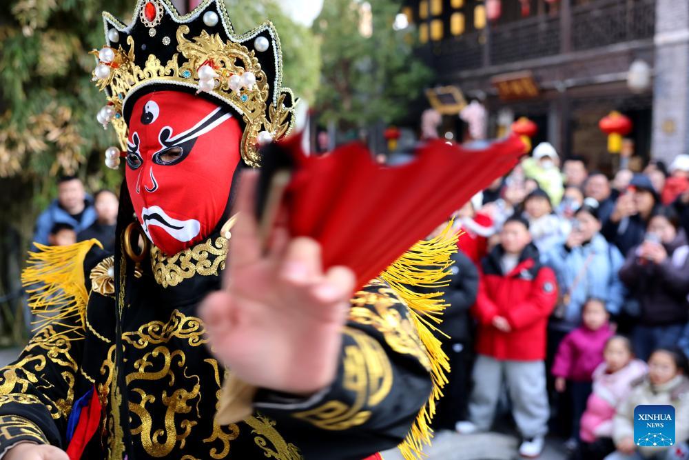 A folk artist is pictured during "bianlian," a face-changing performance featured in Sichuan Opera, in Taierzhuang ancient town of Zaozhuang, east China's Shandong Province, Jan. 1, 2026. China's economy kicked off 2026 with robust momentum, as evidenced by bustling economic activity in the year's first days. (Photo by Sun Zhongzhe/Xinhua)