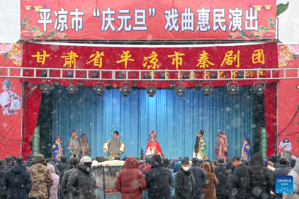 People watch an opera performance in snow in Pingliang, northwest China's Gansu Province Jan. 2, 2026 China's economy kicked off 2026 with robust momentum, as evidenced by bustling economic activity in the year's first days. (Photo by Wu Xihui/Xinhua)