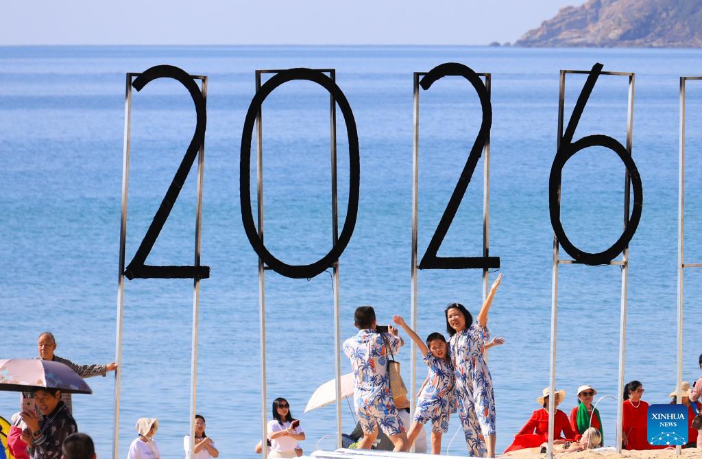 Tourists pose for photos at a scenic area in Sanya, south China's Hainan Province, Jan. 1, 2026. China's economy kicked off 2026 with robust momentum, as evidenced by bustling economic activity in the year's first days. (Photo by Li Xueshi/Xinhua)