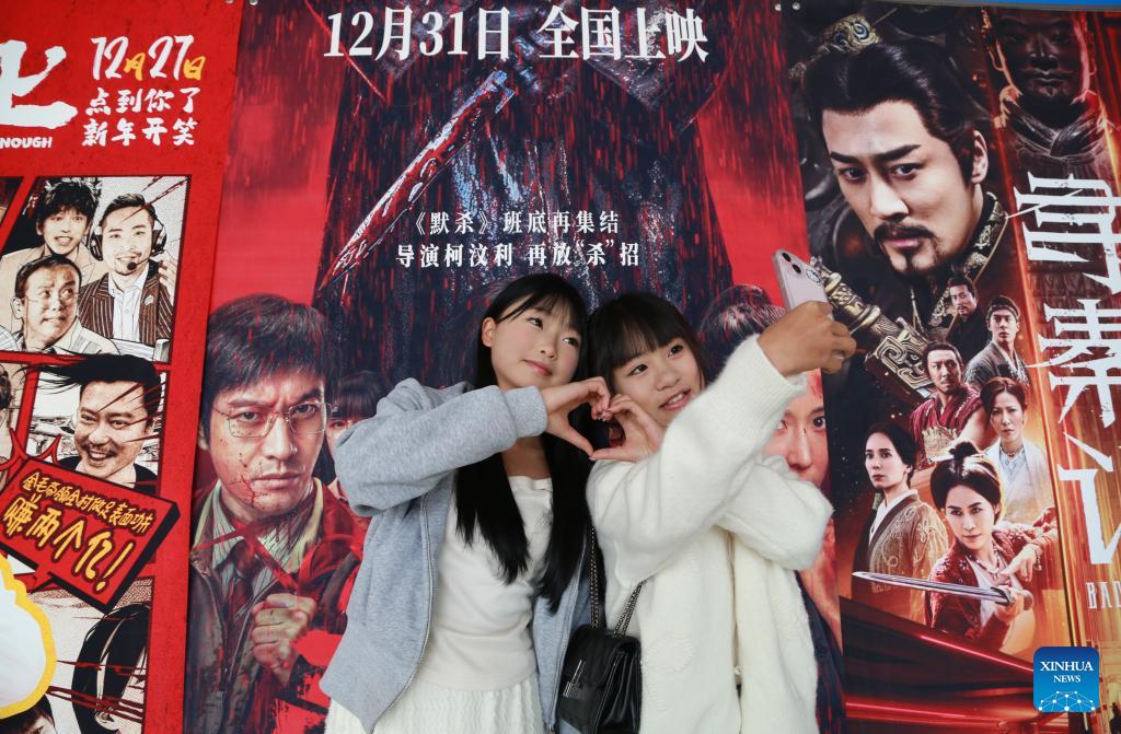 People take selfies with movie posters at a cinema in Mengzi, southwest China's Yunnan Province, Jan. 1, 2026. China's economy kicked off 2026 with robust momentum, as evidenced by bustling economic activity in the year's first days. (Photo by Xue Yingying/Xinhua)
