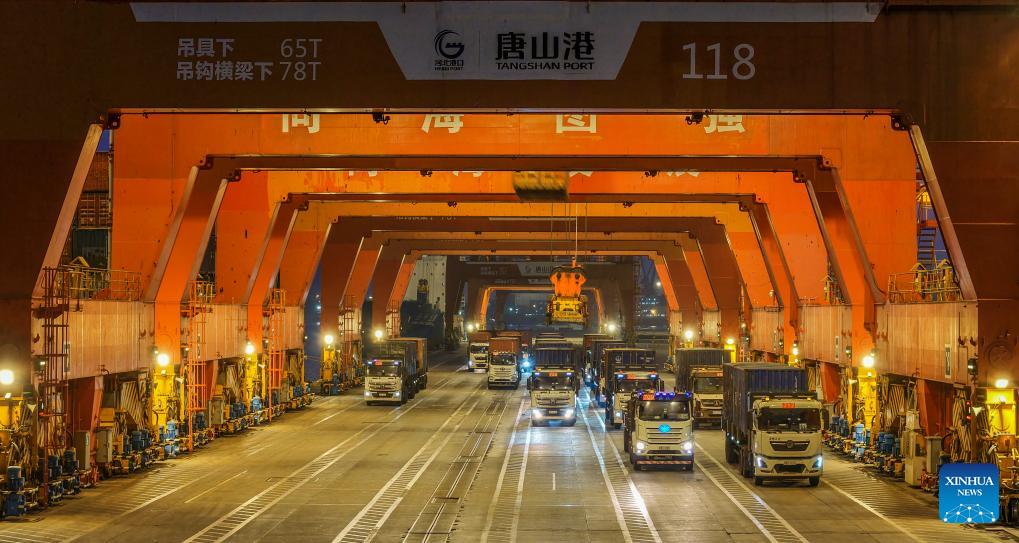 A drone phone taken on Jan. 2, 2026 shows trucks loaded with containers at the Tangshan Port in Tangshan, north China's Hebei Province. China's economy kicked off 2026 with robust momentum, as evidenced by bustling economic activity in the year's first days. (Photo by Liu Mancang/Xinhua)