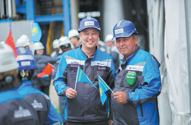 Chinese workers are pictured at the inauguration ceremony for the upgrade project of the Caspian Asphalt Plant in Aktau, Kazakhstan, on May 5.This expansion will ease Kazakhstan's shortage of road asphalt for infrastructure development. XINHUA