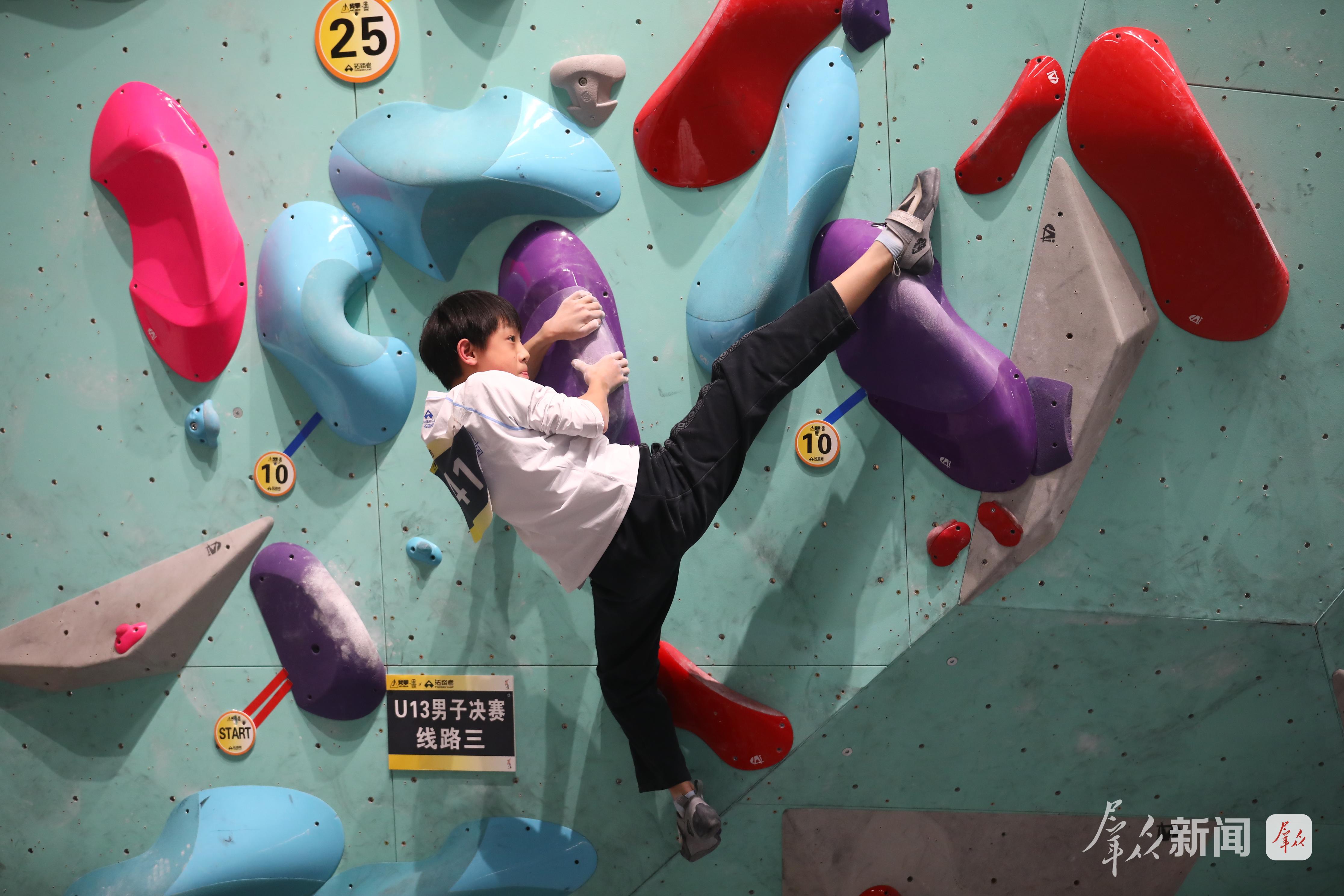 攀岩运动有着“岩壁上的芭蕾”之称,具有很强的技巧性和冒险性。据了解,本次赛事设男子、女子两个组别的U11、U13、U15三个年龄段。