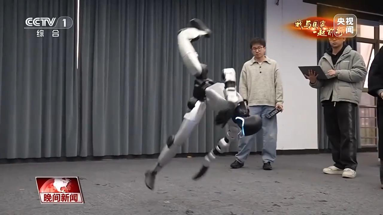 宇树科技股份有限公司 高远:我们看到,它有一个非常长的滞空时间。瞬间又爆发出非常强劲的力量,落地的时候,它没有用手或者膝盖去支撑形成三角关系,而是两条腿直接站在地上,这个难度会非常大。