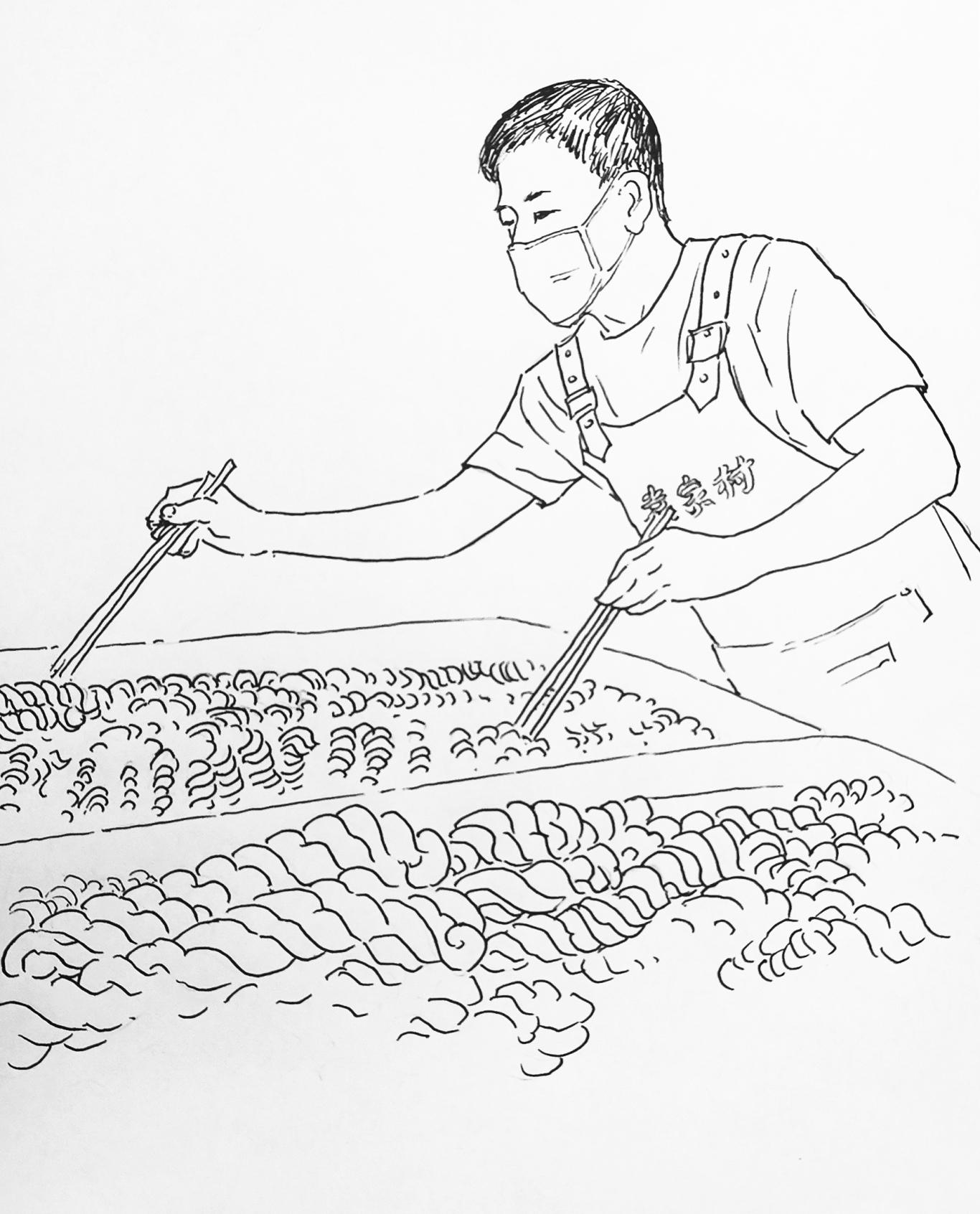 刘施安托起10多斤重已经醒透的面坯,用力甩在案板上,双手快速腾挪,或伸手为掌,或握指为拳,面坯很快揉成条状,又被他揪成一个个面剂子。整个过程行云流水、一气呵成。“这叫打剂子。每个剂子一两八。因为常年打剂子,我左手虎口都磨起老茧子。”刘施安说。随着他左右手反向各拧几下,手腕一抖,麻花就“滋啦”一声滑入金黄的菜籽油中,香味立即弥散开。