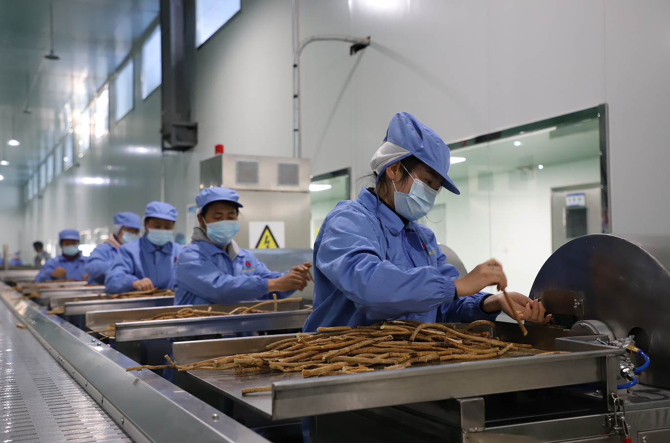 子洲县马蹄沟镇天芪生物科技有限责任公司工作人员正在加工黄芪产品