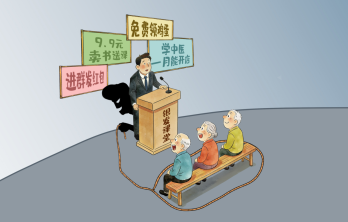 生活中,手机里不时弹出“9.9元卖书送课”“学中医一月能开店”“进群领红包”等广告……这些看似贴心的“福利”,实则是瞄准老年人精心设计的欺诈陷阱。它们利用老年人信息闭塞、渴望健康、情感空虚等特点,将“适老化”服务变为一场“坑老化”骗局。
