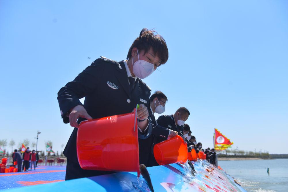 2022年4月28日,渔政管理站工作人员向查干湖投放鱼苗。查干湖通过“松花江—查干湖—嫩江”连通工程,以活水交换提升水质;南北景区各建一座污水处理厂,实现生活污水全收集、全处理;遍植荷花等水生植物,结合增殖放流和科学捕捞,形成“以水养鱼、以鱼净水”的生态循环,水质连续4年保持在Ⅳ类标准,鲜鱼年产量保持在5000吨左右。