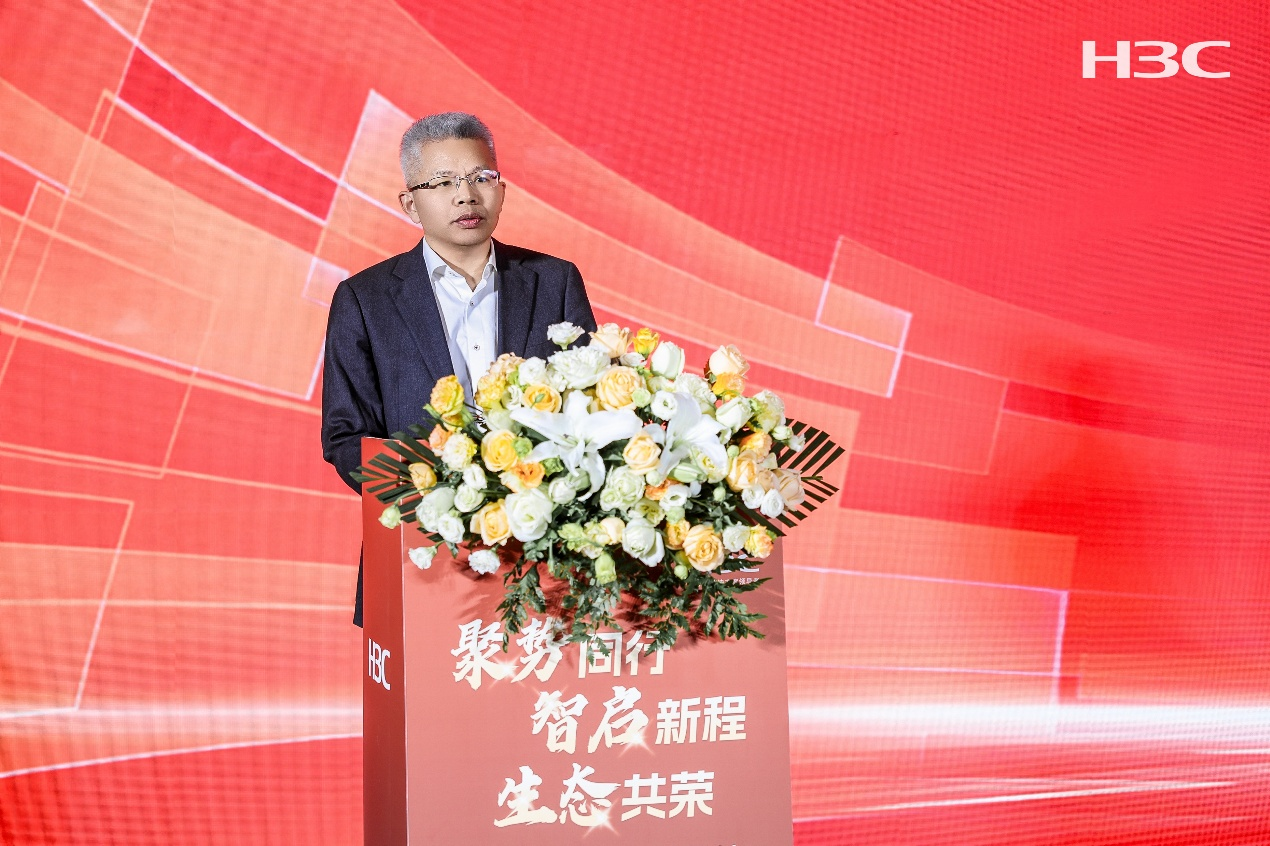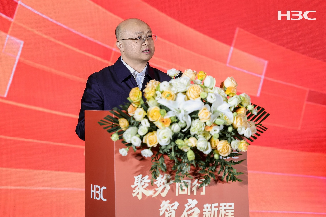 陕西省工商联副主席、亿杰控股集团董事长陈高志出席大会并作开场致辞,他回顾了亿杰控股与新华三在人工智能、计算存储、网络安全等领域的深入合作,高度肯定新华三的服务能力与技术积淀。他表示,作为综合性高新技术企业,亿杰控股正积极践行数字中国战略,大力发展智慧政务、智慧财税、工业安全互联网等数字业务,未来期待与新华三进一步深化协同,共同服务陕西数字产业化与产业数字化,在发展新质生产力、推动高质量发展的进程中实现互利共赢。