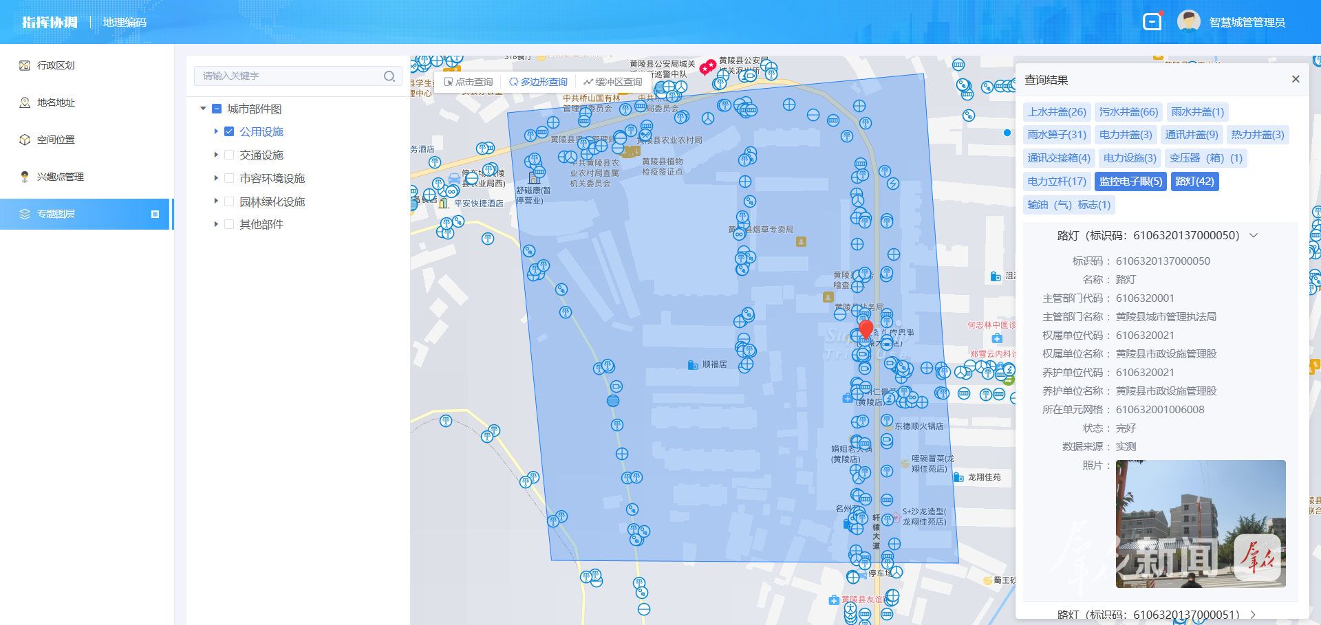 智慧城管不仅“看得见”,更“管得准”。黄陵县为每处城市部件办理了“数字身份证”。据中电系统建设工程有限公司王晨介绍,他和他的团队已完成城区8.11平方公里数据普查,为3万多个路灯、井盖等部件建立了详细的“数字档案”。