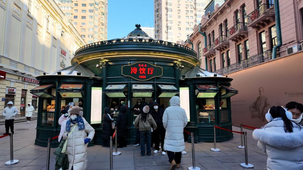 隆冬时节,哈尔滨中央大街上,人头攒动。尽管冷得跺脚,但游客们依旧入乡随俗,要来尝一尝马迭尔冰棍。