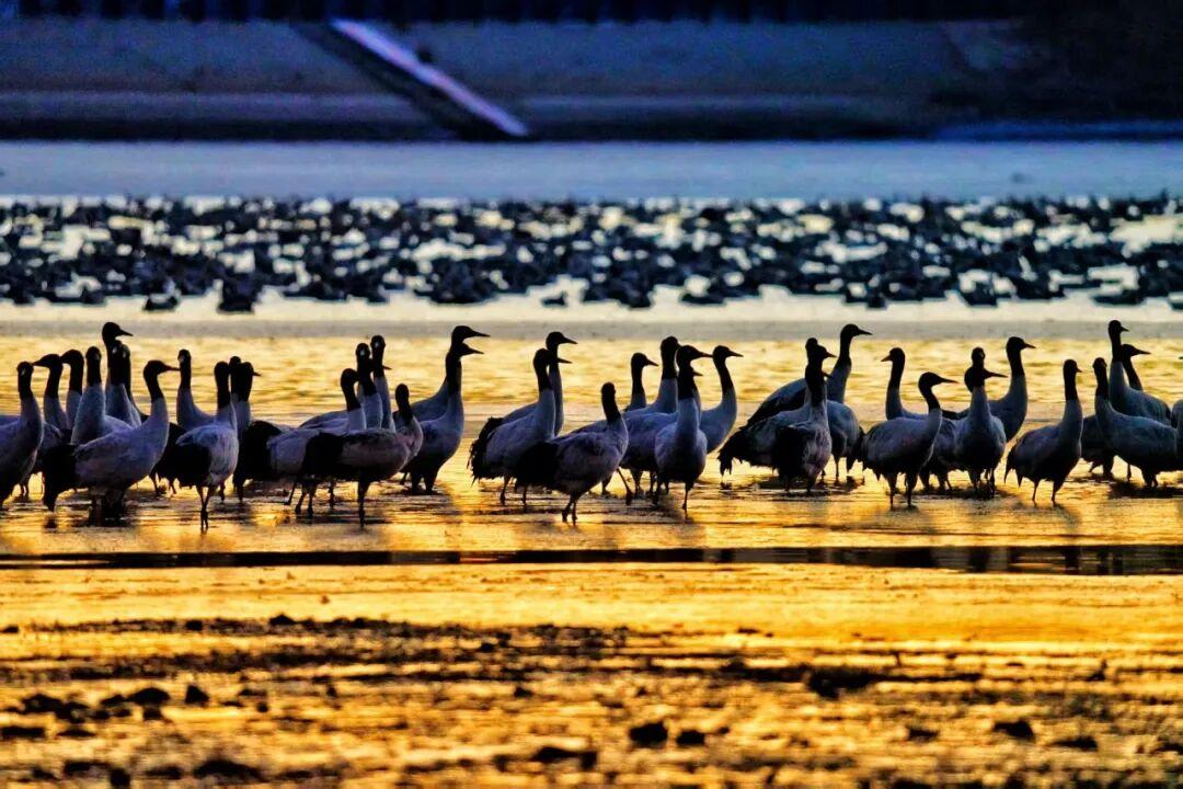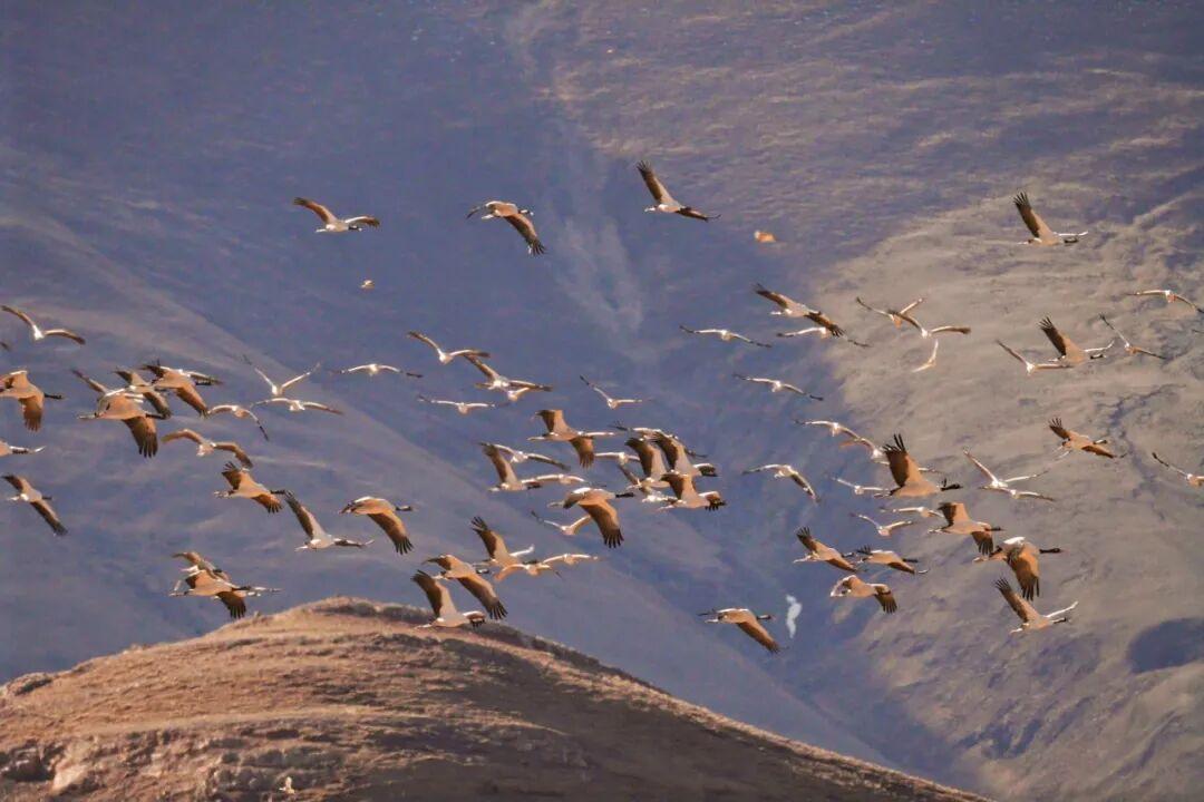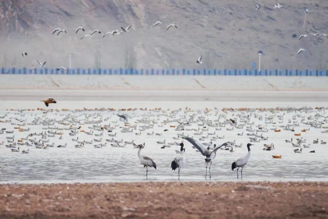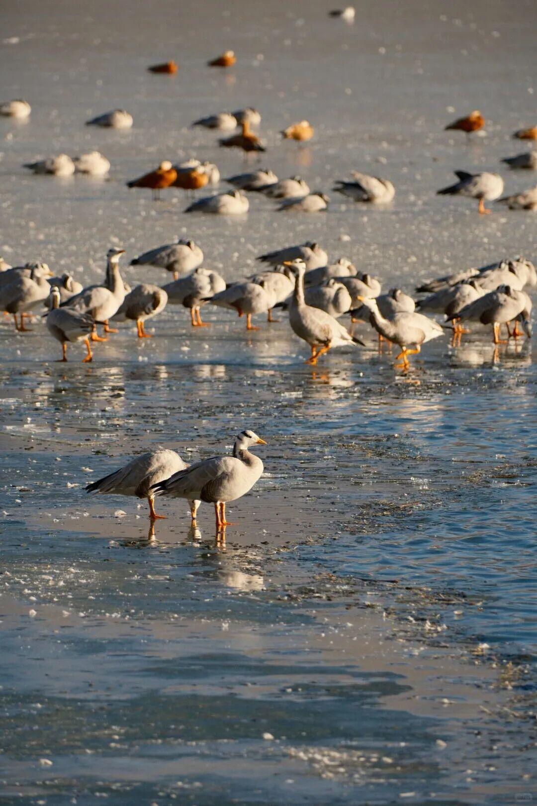 布达拉宫巍然耸立与结冰的水面构成一幅静谧的冬日画卷。这里是候鸟越冬的天堂,黑颈鹤、斑头雁等候鸟在此栖息,为湿地增添了无限生机。