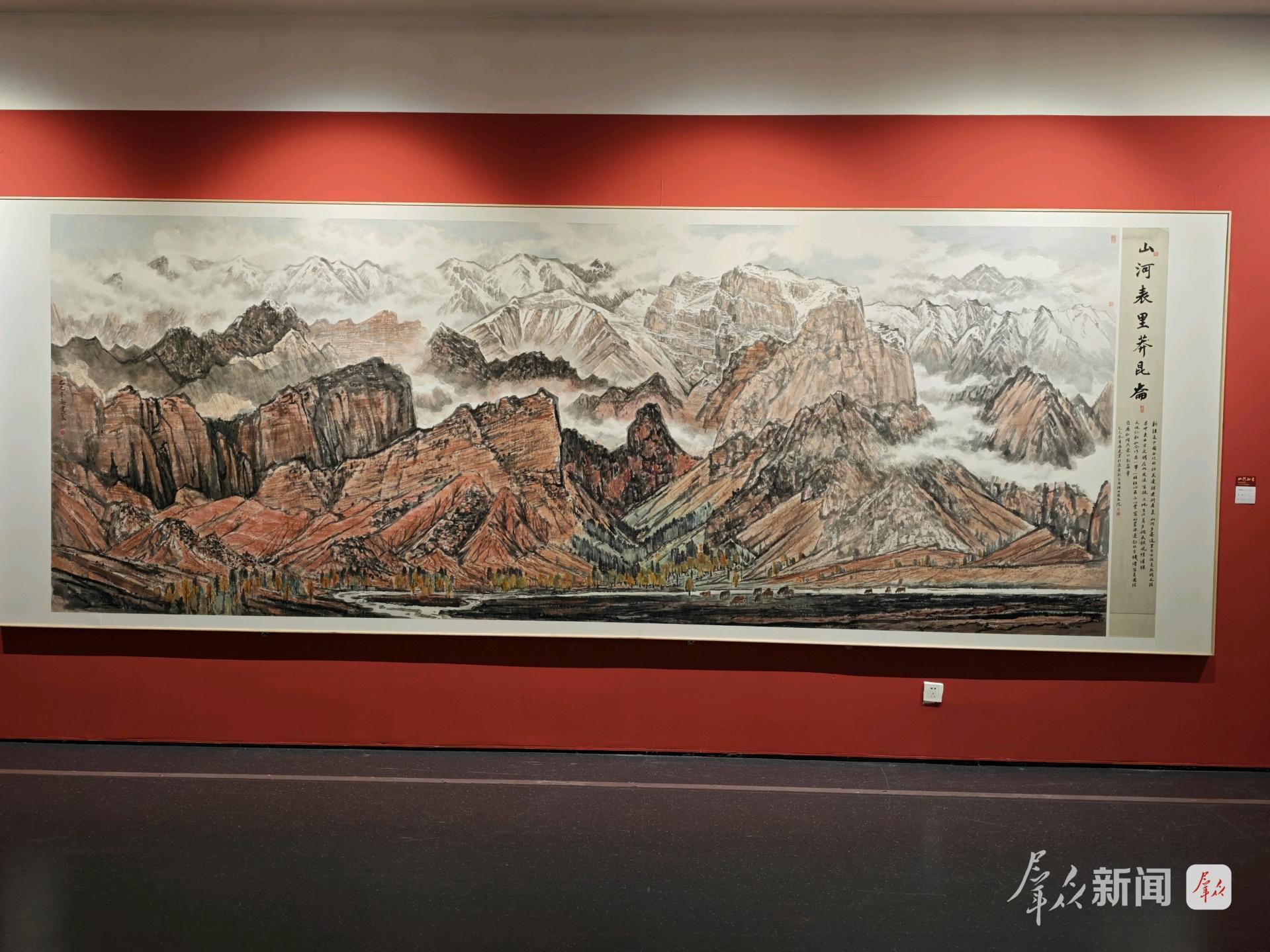本次展览还特别呈现了陕西国画院耿齐、张立等人主创的巨幅中国画《山河赋》(局部复制品)。原作陈列于雄安新区图书馆大厅,高近24米,为目前我国公共文化空间最高的巨幅山水作品之一。画面结构严谨、意境雄浑,群峰巍峨、山河绵延,展现出中华民族生生不息的生命力与新时代的壮美气象。