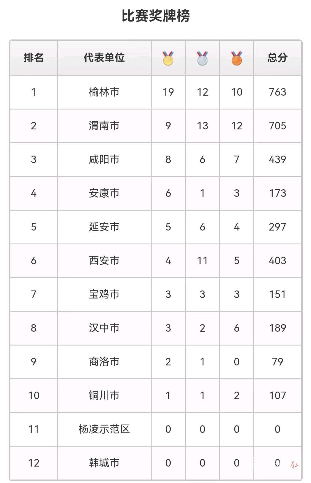 其中,榆林市以19金12银10铜的优势暂居榜首,总分763分排名第一;渭南市获得9金13银12铜,总分705分紧随其后。