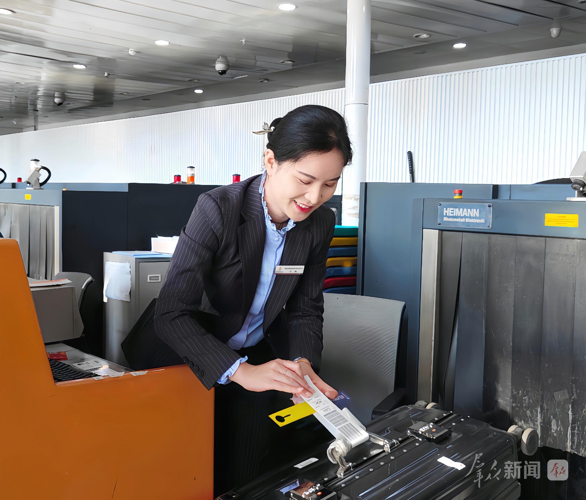 “行李里面有锂电池、充电宝、打火机和贵重、易碎物品吗?”邱爽询问完旅客,麻利地给行李绑上行李条。