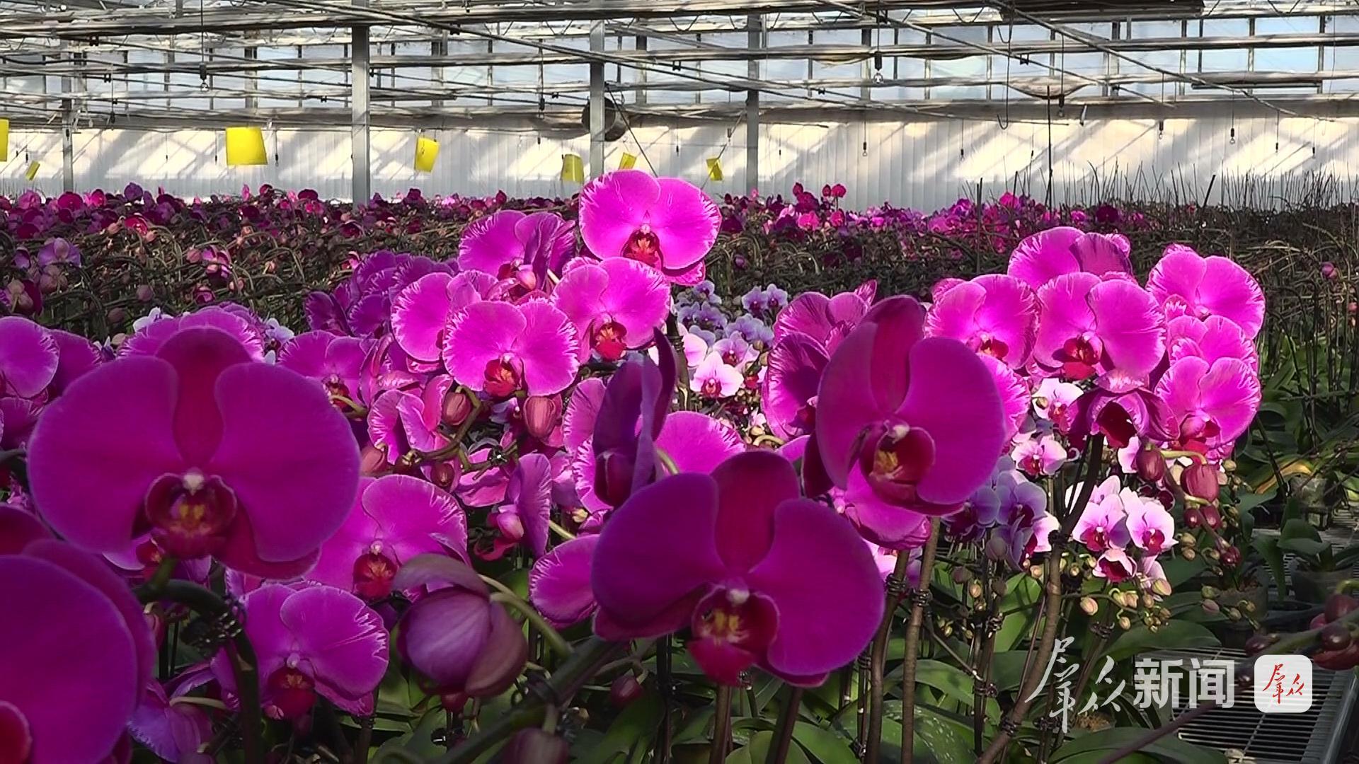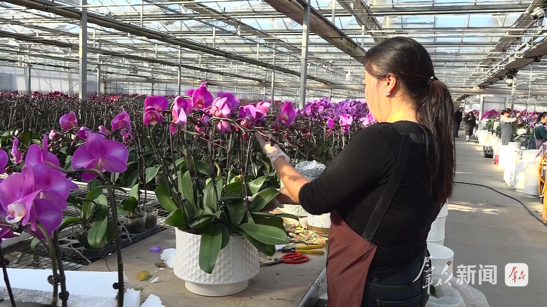 新春花卉市场同样热闹非凡。位于渭丰街道的裕兴农业科技发展有限公司温室里,百万株蝴蝶兰竞相开放,深红、金黄、嫩粉等各色花朵缀满枝头,呈现出缤纷的新春图景。技术人员颜彩霞介绍,当前正为春节市场加紧组盆,每日工作量达百余盆。企业种植蝴蝶兰150万株、涵盖百余品种,主要供应西安市场,也吸引不少外地客商。此外,公司已带动周边110余名村民实现稳定就业,一朵朵蝴蝶兰正串联起一条助农增收的“美丽产业”,成为鄠邑乡村振兴中的一抹亮色。