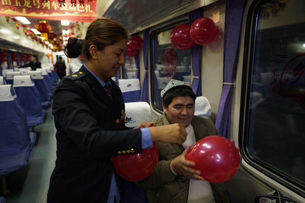 与阿卜来提·乃比同路的乡亲们,行囊里都装满了南疆各色特产。厚实的杏干泛着蜜色光泽,花样精巧的糕点码放整齐,核桃木雕成的小碗木纹如水波流转……南疆的特色风物在车厢里聚拢,人们过年盼团圆的喜悦在这方寸之间蔓延。