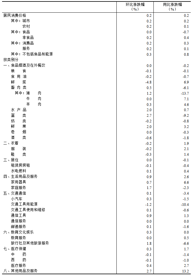 1月份,全国居民消费价格环比上涨0.2%。其中,城市上涨0.2%,农村上涨0.2%;食品价格持平,非食品价格上涨0.2%;消费品价格上涨0.2%,服务价格上涨0.2%。