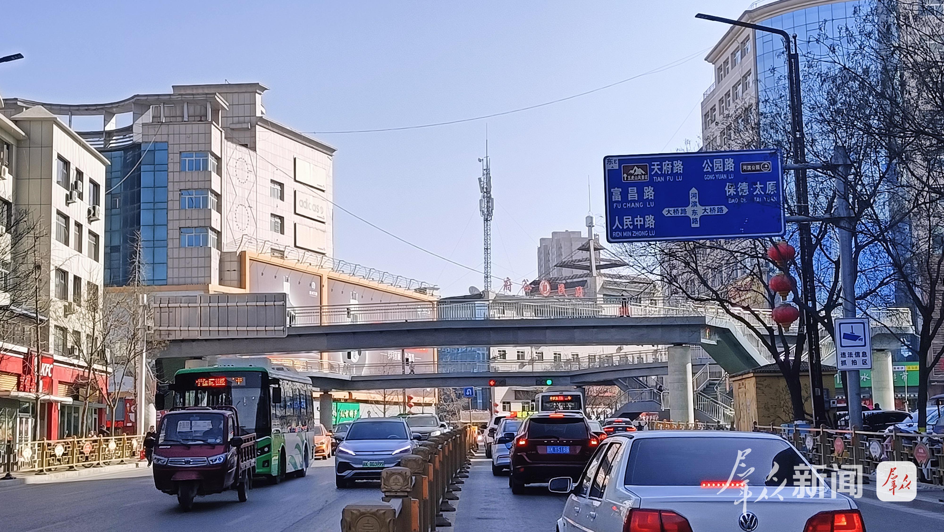 据了解,大桥路东接天府路和富昌路,南连府保黄河大桥,西接河滨东路,北通人民路,周边聚集了大型商场、酒店(饭店)、幼儿园、前石畔学校、府谷镇镇政府、县医院、加油站、银行、德克士、前十畔市场、停车场及河滨公园运动场等,人流量和车流量极大,交通拥堵严重,给市民出行带来诸多不便。