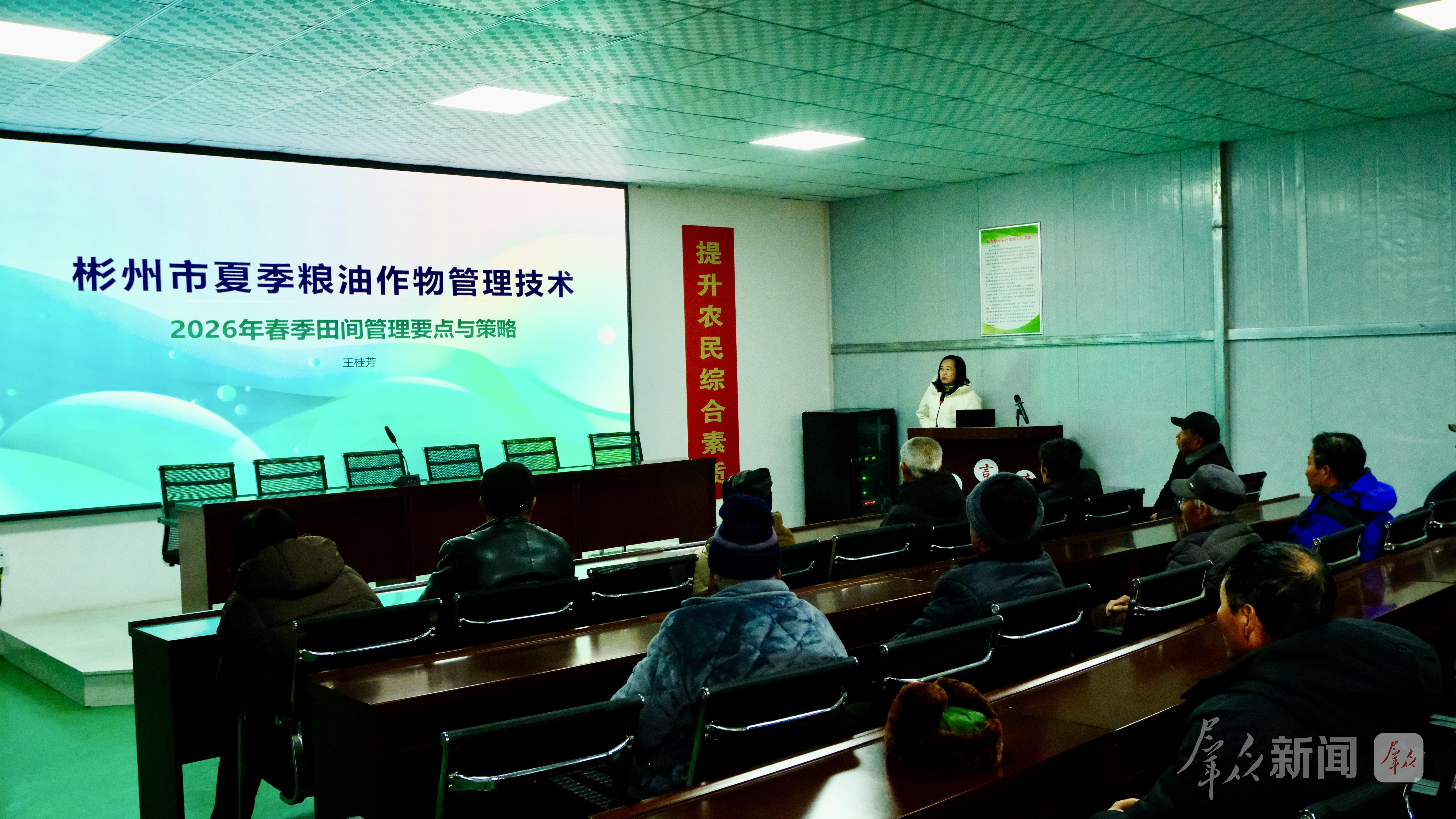 1月29日,在彬州市北极镇的一间培训教室里,40多位村民和种植大户端坐其间,目光紧紧聚焦在讲台上,认真聆听女农艺师王桂芳讲授“2026年春季田间管理要点与策略”。她声音清亮、语言朴实,结合本地种植实例娓娓道来,让台下农户听得懂、能领会、用得上。