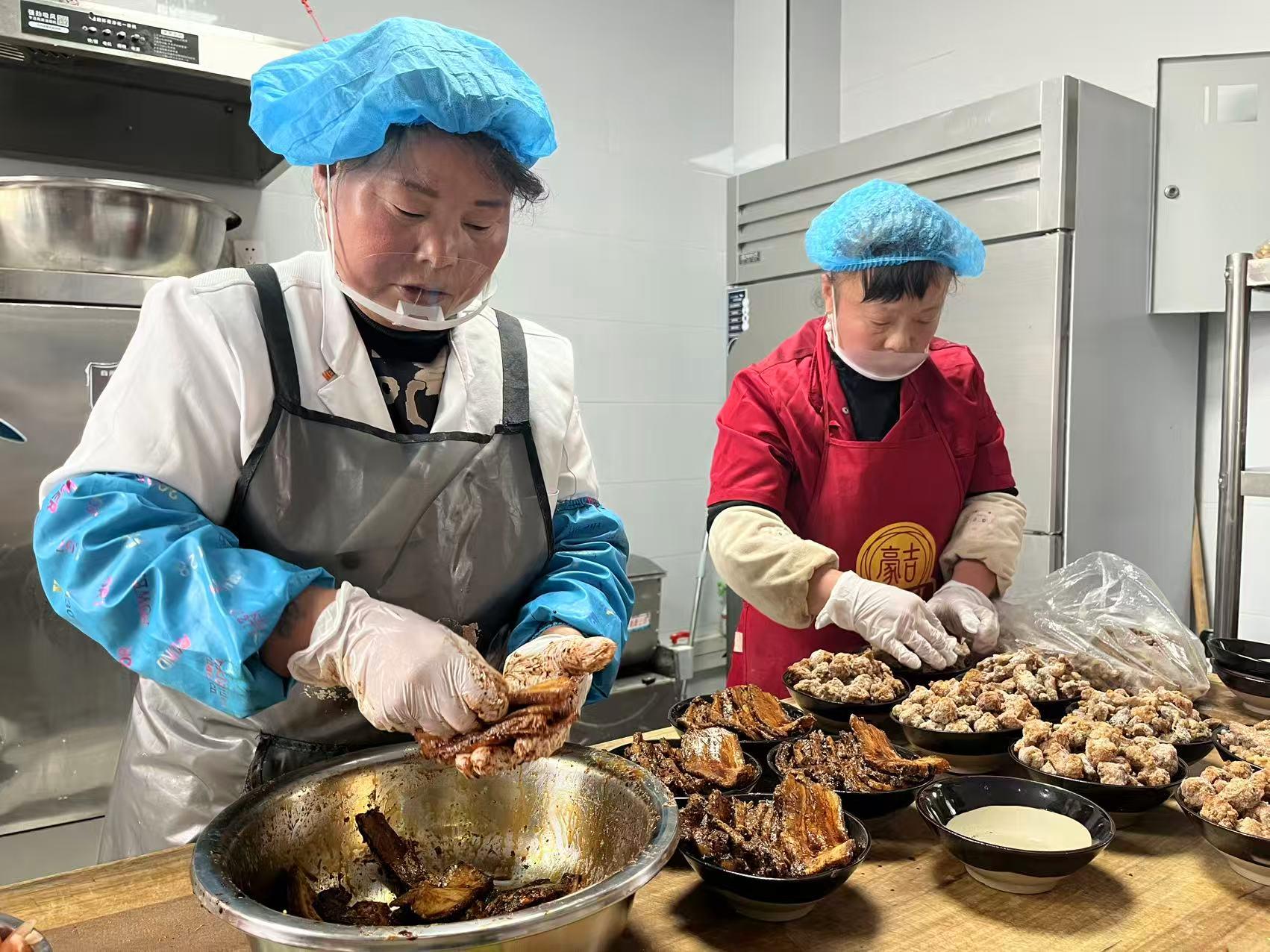 随着就餐人流增多,一份份刚出锅的蒸碗接连从蒸箱中端出,金黄饱满的肉丸子、咸香酥烂的小酥肉、油润厚实的条子肉、香甜软糯的八宝饭……六种传统蒸碗整齐摆放,色泽诱人、香气扑鼻,不仅丰富了食堂日常菜单,更让居民们提前尝到地道年味。