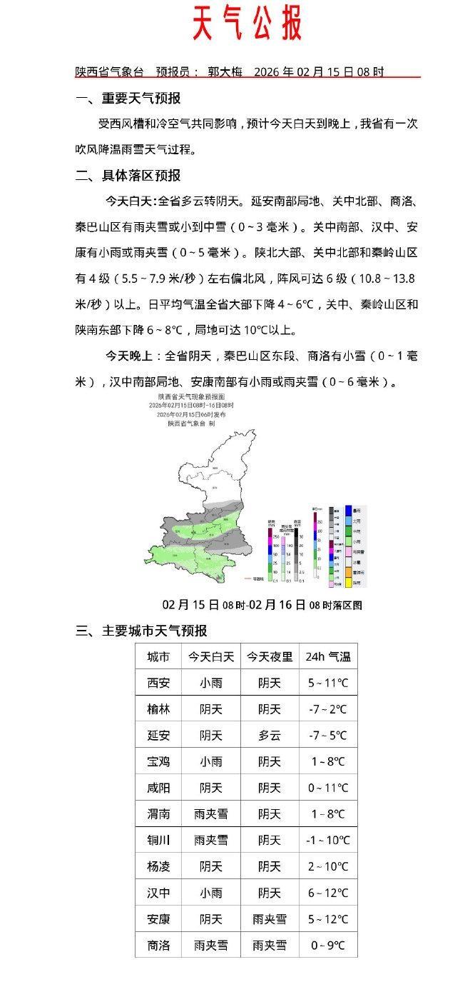 今天白天:城区及平原地区有小雨,南部山区有雨夹雪或小雪。