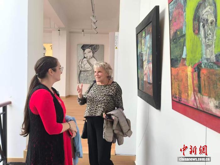 2月12日,爱娃与意大利朋友参观正在海口骑楼老街展出的“文艺复兴·佛罗伦萨”艺术展。 中新网记者 张茜翼 摄