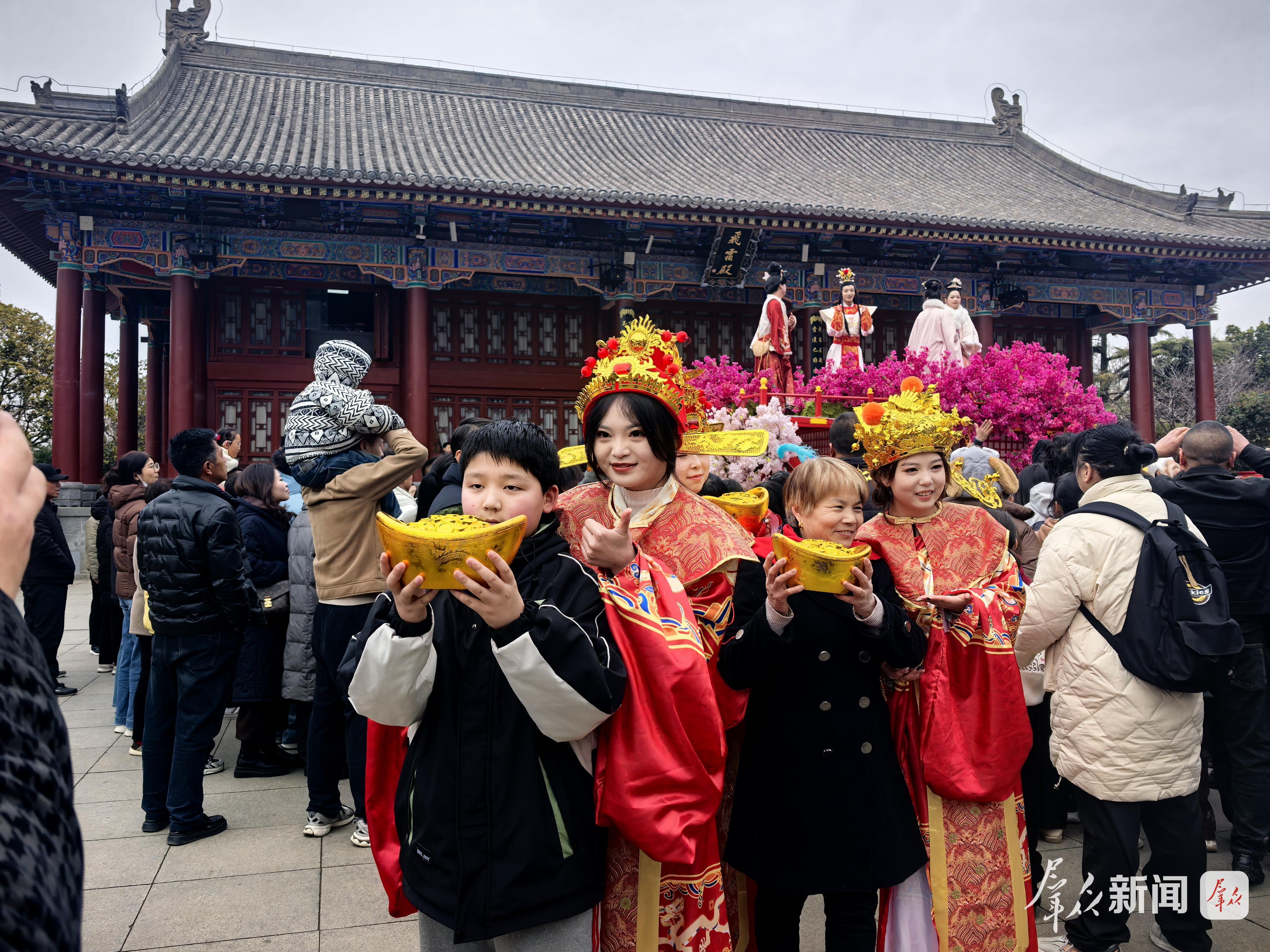 除了百人汉服巡游、“马上有财”主题方阵巡游等亮点节目,景区还精心编排了《那三个兵》《金仙招婿》《皇上请就位》等趣味NPC互动微演艺,吸引众多市民游客参与其中,在欢声笑语中体验唐宫新春文化。