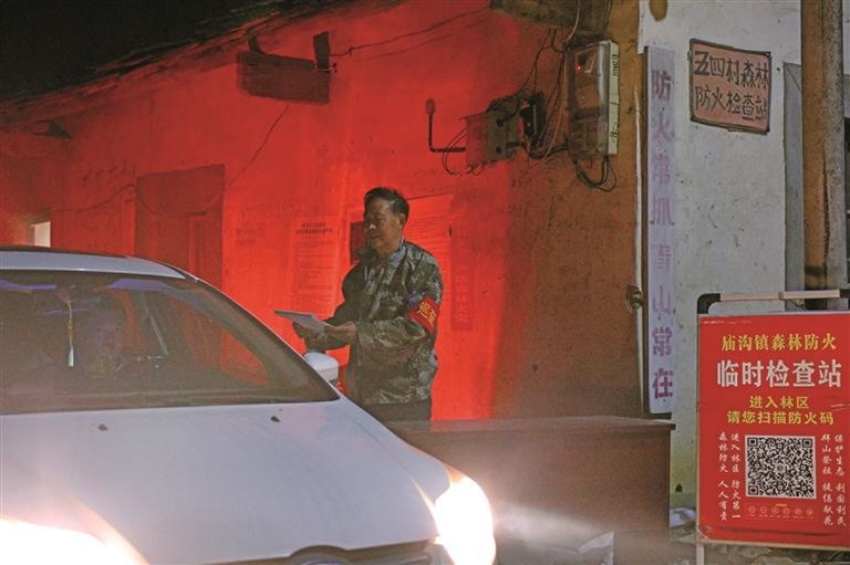 18时,天色渐暗。在五四村进山路口,护林员付增礼守着临时检查站。一张桌子、一本登记册,是这里的全部家当。