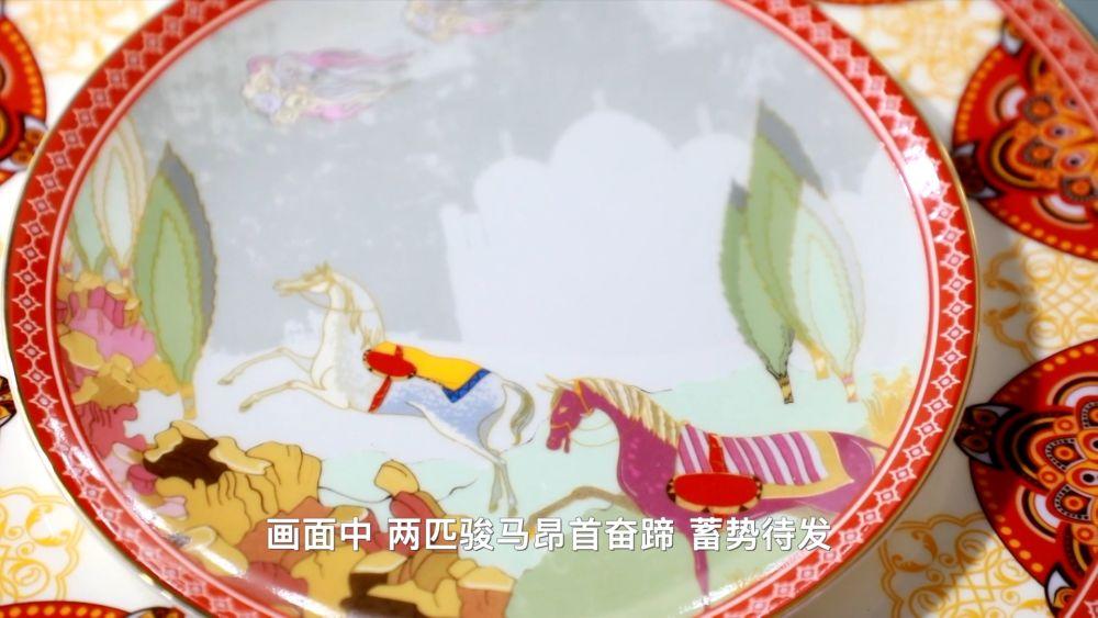 淄博泰山瓷业有限公司副总经理张广文表示,“骐骥”指传说中的千里马,象征事业腾达,人才兴旺;“满堂”则呼应陶瓷餐具的使用场景。画面中,两匹骏马昂首奋蹄,蓄势待发,表达出马年跃马扬鞭、龙马精神的美好祝愿。