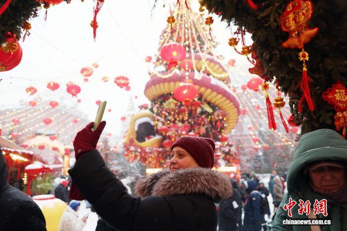 当地时间2月16日,中国农历除夕,第三届莫斯科“欢乐春节”活动在莫斯科市中心隆重启幕。图为俄罗斯民众在活动现场拍照打卡。 中新社记者 田冰 摄