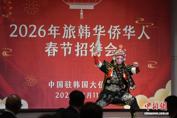 当地时间2月11日晚,中国驻韩国大使馆举办“2026年旅韩华侨华人春节招待会”。图为活动现场上演川剧变脸节目。 中新社记者 刘旭 摄