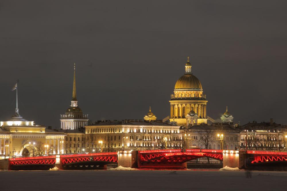 2月15日晚,俄罗斯圣彼得堡冬宫桥亮起“中国红”,迎接马年春节。新华社发(莫京娜摄)