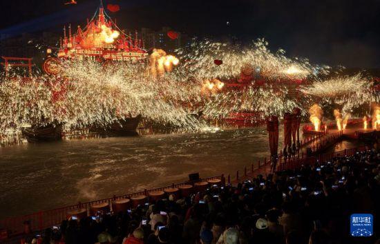 2月20日,民间艺人在河北省唐山市丰南区河头老街为游客表演“打树花”(无人机照片)。