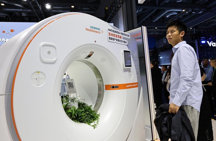 Visitors view a dual-source photon-counting CT machine of Siemens, which made its debut in Asia, during the China International Import Expo (CIIE) in east China's Shanghai, Nov. 6, 2025. (Xinhua/Fang Zhe)