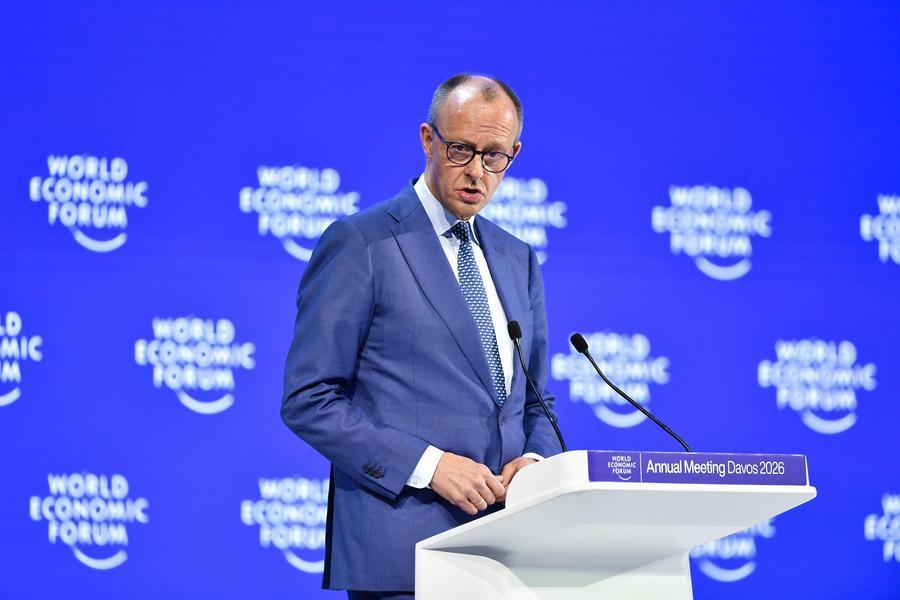 German Chancellor Friedrich Merz speaks at the World Economic Forum (WEF) Annual Meeting 2026 in Davos, Switzerland, Jan. 22, 2026. (Xinhua/Lian Yi)